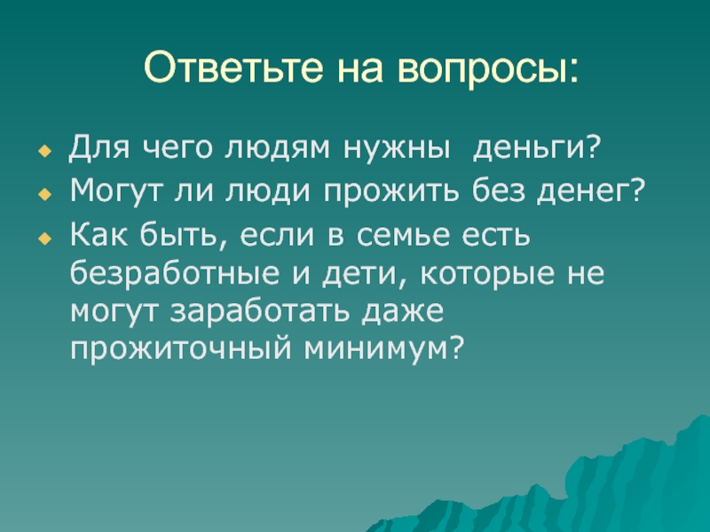 Ответьте на вопросы:Для чего людям нужны деньги?Могут ли люди прожить без денег?Как быть, если в семье есть