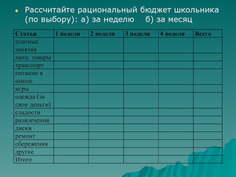 Слайд 13Рассчитайте рациональный бюджет школьника (по выбору): а) за неделю б)