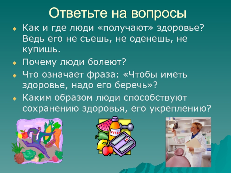 Ответьте на вопросыКак и где люди «получают» здоровье? Ведь его не съешь, не оденешь, не купишь.Почему люди