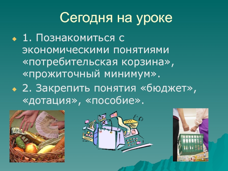 Сегодня на уроке1. Познакомиться с экономическими понятиями «потребительская корзина», «прожиточный минимум».2. Закрепить понятия «бюджет», «дотация», «пособие».