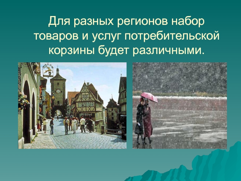 Слайд 7Для разных регионов набор товаров и услуг потребительской корзины будет различными.