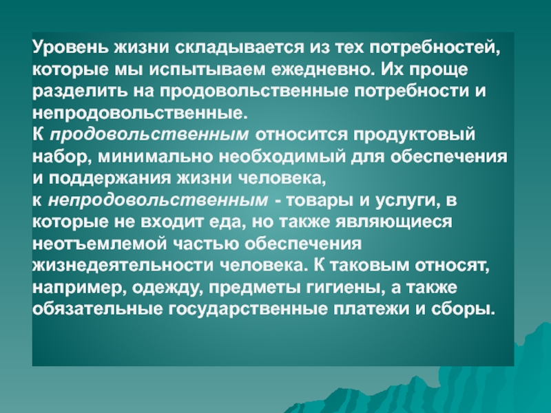 Слайд 10Уровень жизни складывается из тех потребностей, которые мы испытываем ежедневно. Их