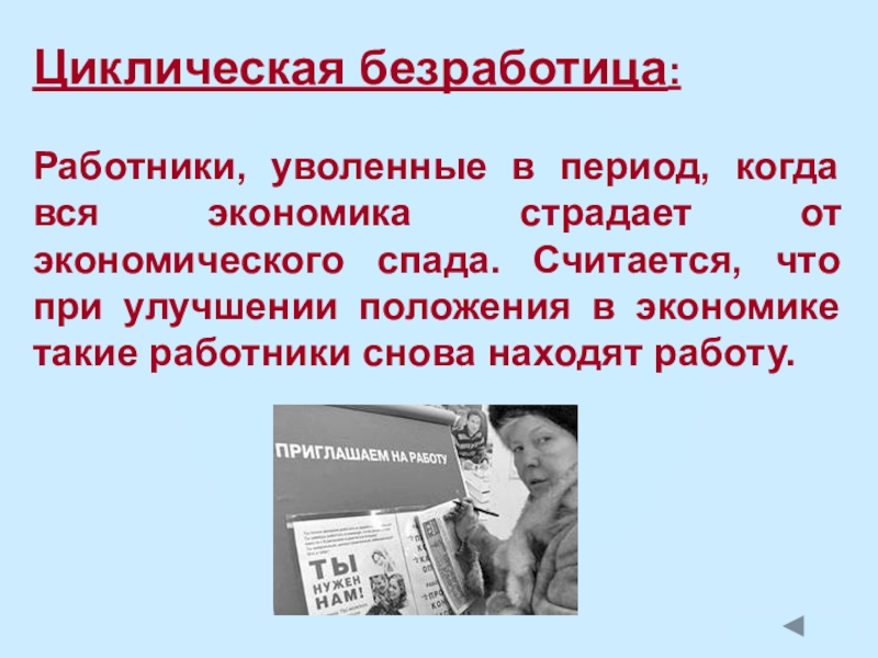 Циклическая безработица: Работники, уволенные в период, когда вся экономика страдает от экономического спада. Считается, что при улучшении