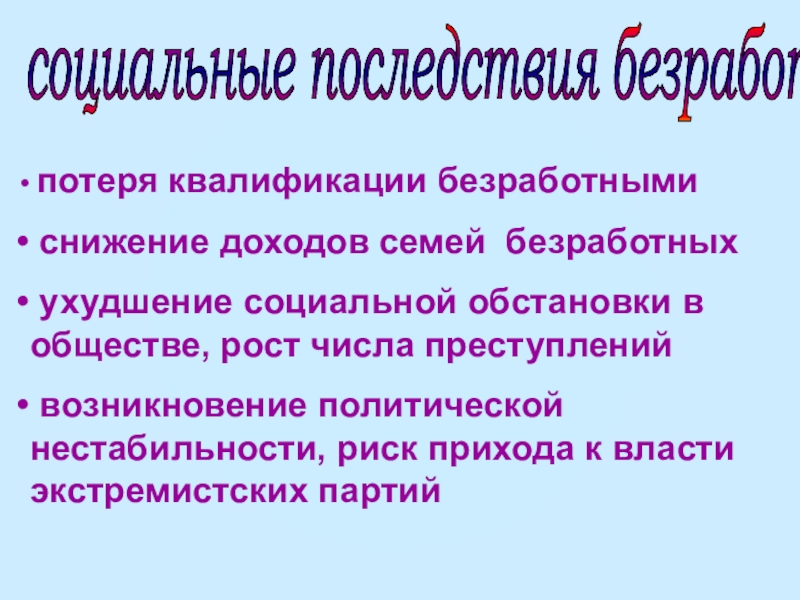 социальные последствия безработицы: потеря квалификации безработными снижение доходов семей безработных ухудшение социальной обстановки в  обществе, рост