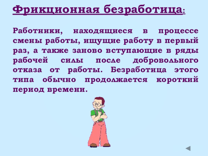 раз, а также заново вступающие в ряды рабочей силы после добровольного отказа от работы. Безработица этого типа обычно продолжается короткий период времени.