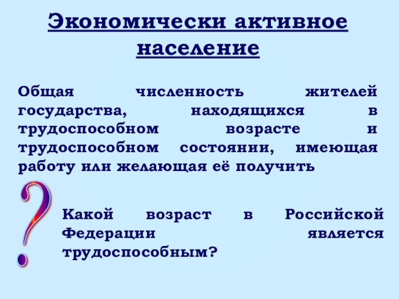 Экономически активное населениеОбщая численность жителей государства, находящихся в трудоспособном возрасте и трудоспособном состоянии, имеющая работу или желающая