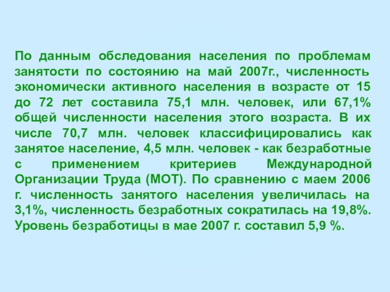 Слайд 12По данным обследования населения по проблемам занятости по состоянию на май