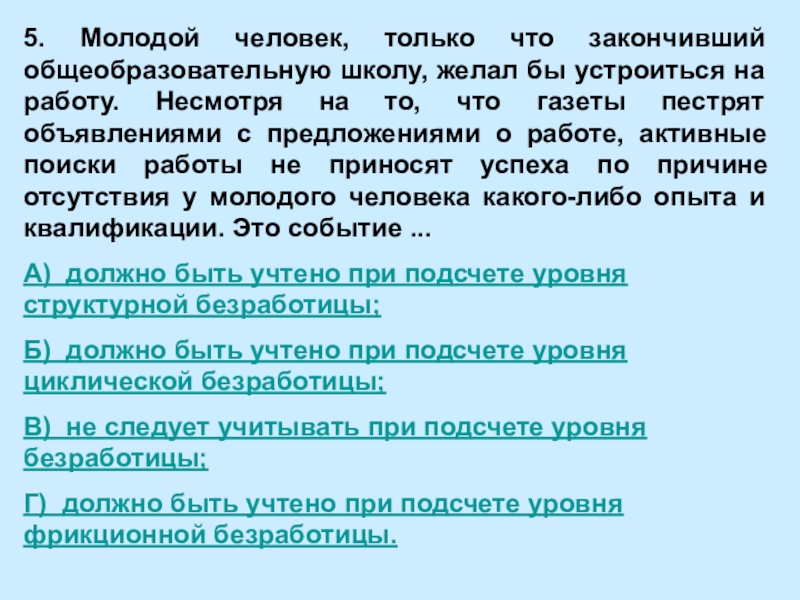 5. Молодой человек, только что закончивший общеобразовательную школу, желал бы устроиться на работу. Несмотря на то, что