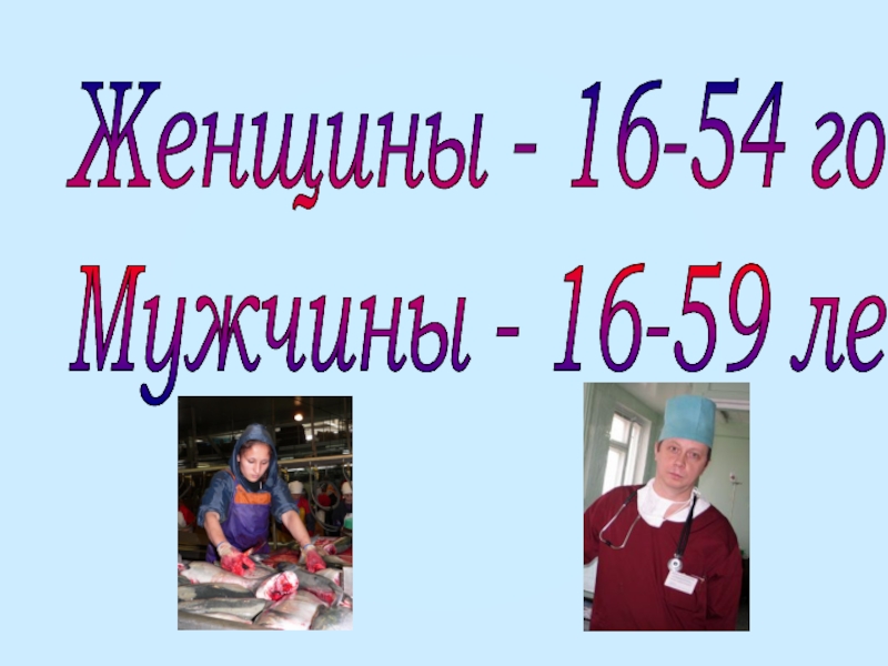 Слайд 4Женщины - 16-54 года Мужчины - 16-59 лет
