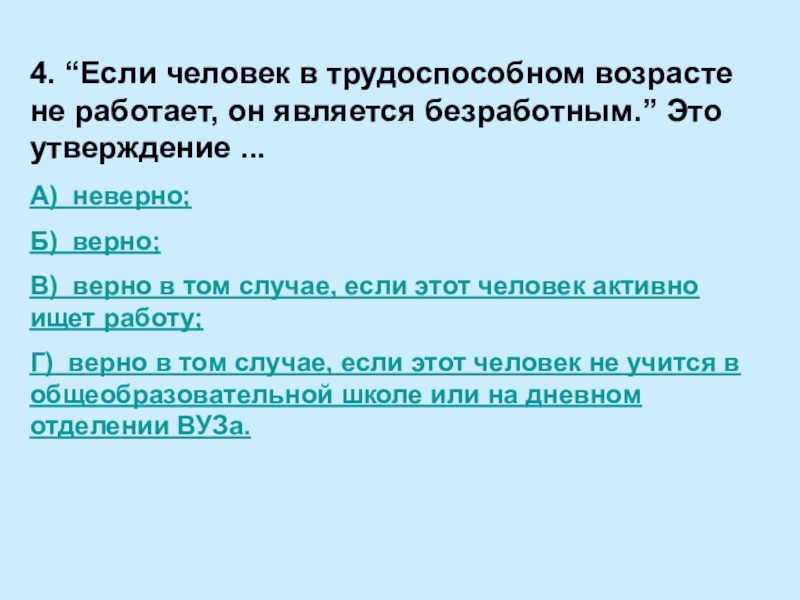 4. “Если человек в трудоспособном возрасте не работает, он является безработным.” Это утверждение ...А) неверно;Б) верно;В) верно