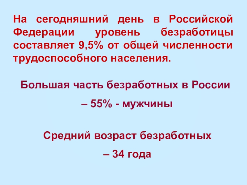 На сегодняшний день в Российской Федерации уровень безработицы составляет 9,5% от общей численности трудоспособного населения.Большая часть безработных