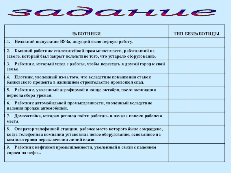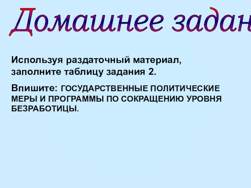 Домашнее задание:Используя раздаточный материал, заполните таблицу задания 2.Впишите: ГОСУДАРСТВЕННЫЕ ПОЛИТИЧЕСКИЕ МЕРЫ И ПРОГРАММЫ ПО СОКРАЩЕНИЮ УРОВНЯ БЕЗРАБОТИЦЫ.