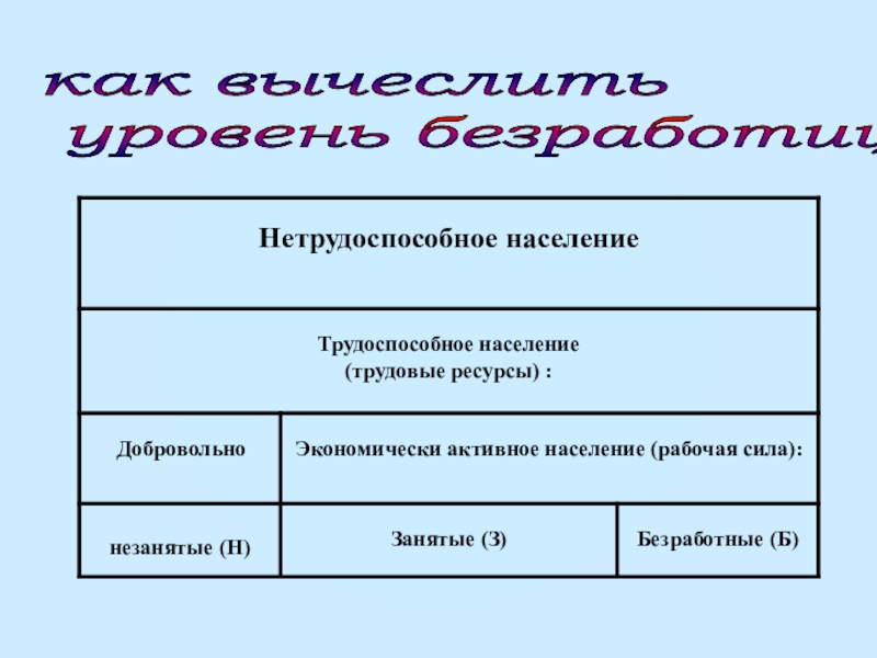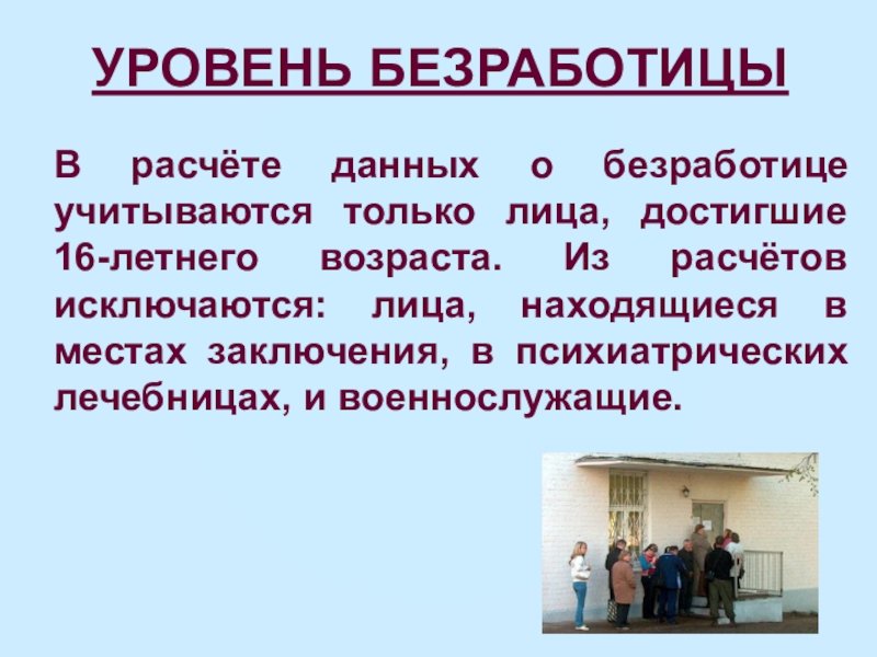 УРОВЕНЬ БЕЗРАБОТИЦЫВ расчёте данных о безработице учитываются только лица, достигшие 16-летнего возраста. Из расчётов исключаются: лица, находящиеся