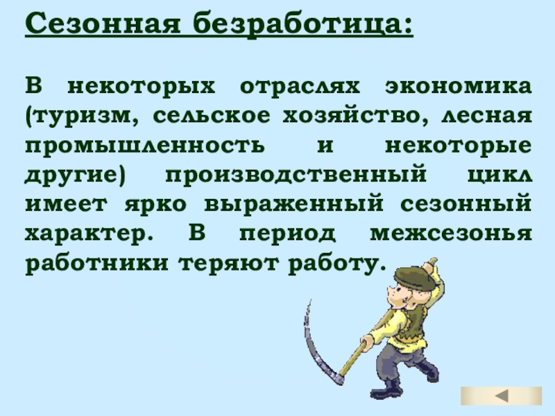 Сезонная безработица: В некоторых отраслях экономика (туризм, сельское хозяйство, лесная промышленность и некоторые другие) производственный цикл имеет