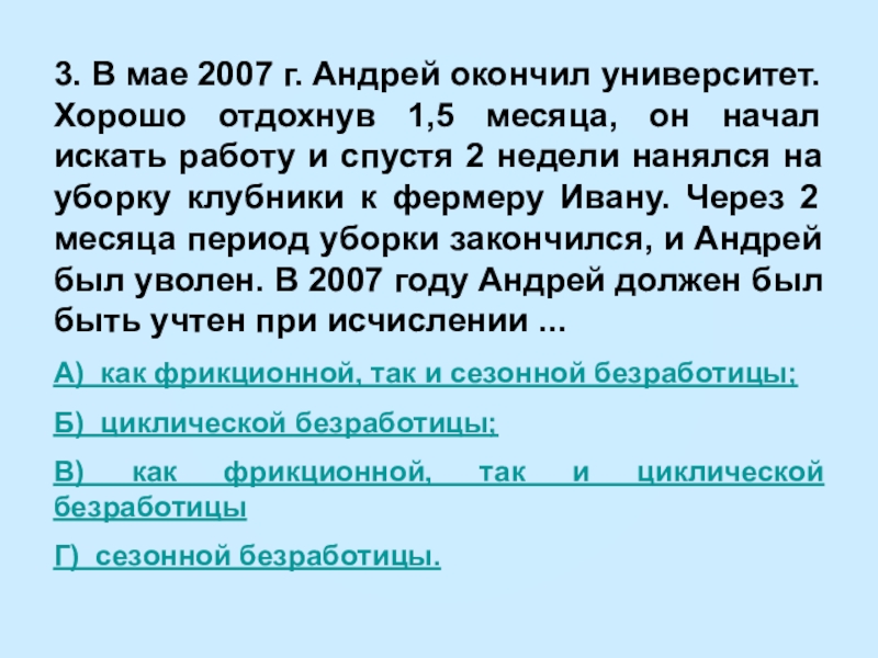 месяца, он начал искать работу и спустя 2 недели нанялся на уборку клубники к фермеру Ивану. Через 2 месяца период уборки закончился, и Андрей был уволен. В 2007 году Андрей должен был быть учтен при исчислении ...