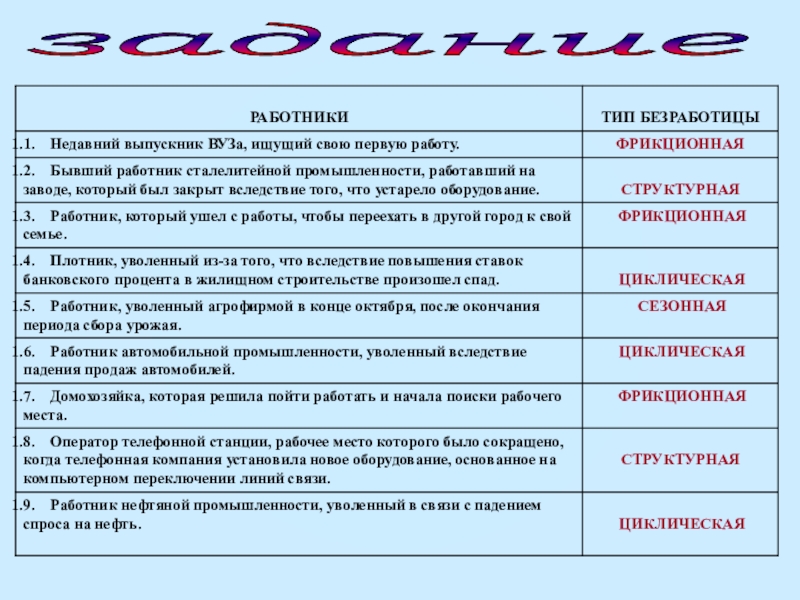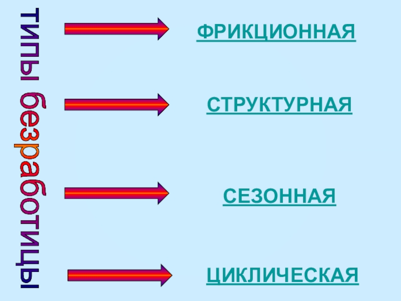 типы безработицыФРИКЦИОННАЯСТРУКТУРНАЯЦИКЛИЧЕСКАЯСЕЗОННАЯ