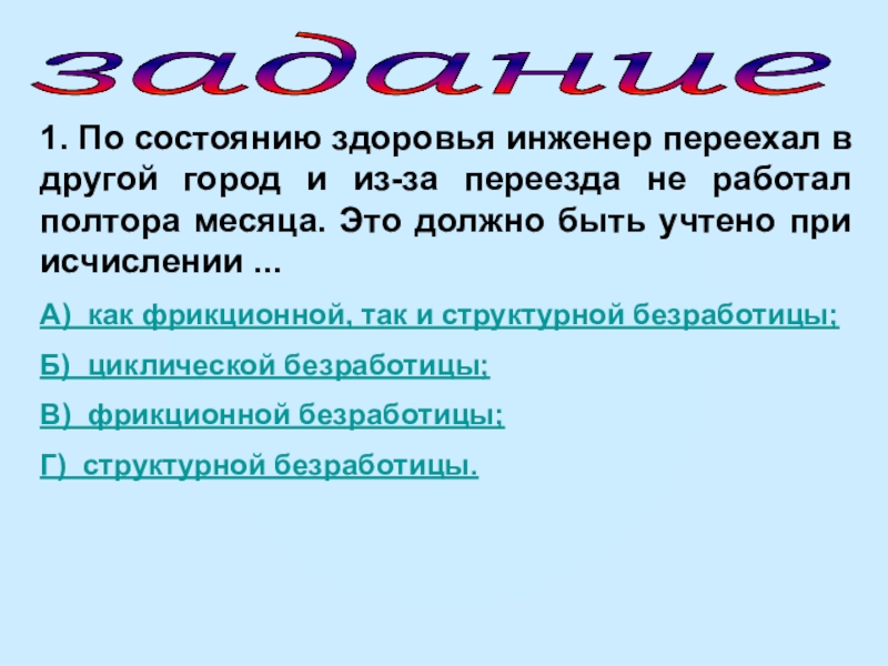 Слайд 214. “Если человек в трудоспособном возрасте не работает, он является безработным.”