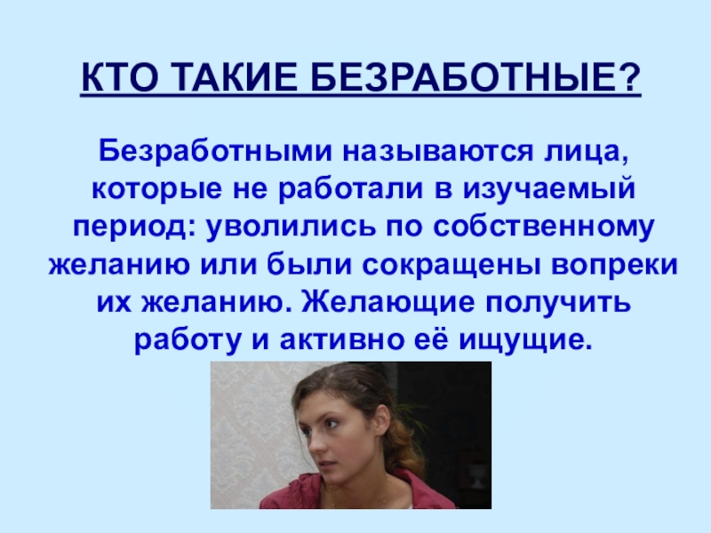 КТО ТАКИЕ БЕЗРАБОТНЫЕ?Безработными называются лица, которые не работали в изучаемый период: уволились по собственному желанию или были