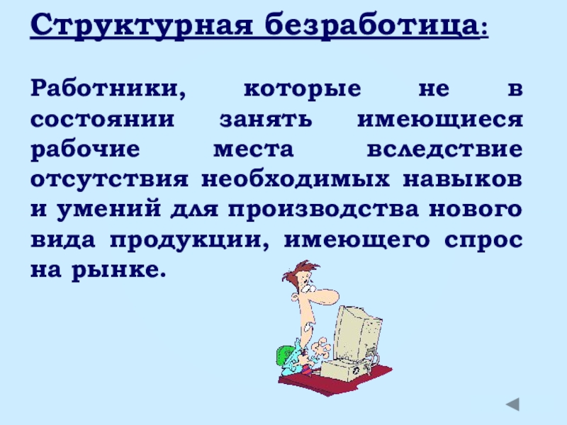 Структурная безработица:Работники, которые не в состоянии занять имеющиеся рабочие места вследствие отсутствия необходимых навыков и умений для