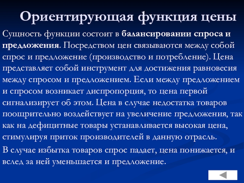 цен связываются между собой спрос и предложение (производство и потребление). Цена представляет собой инструмент для достижения равновесия между спросом и предложением. Если между предложением и спросом возникает диспропорция, то цена первой сигнализирует об этом. Цена в случае недостатка товаров поощрительно воздействует на увеличение предложения, так как на дефицитные товары устанавливается высокая цена, стимулируя приток производителей в данную отрасль.