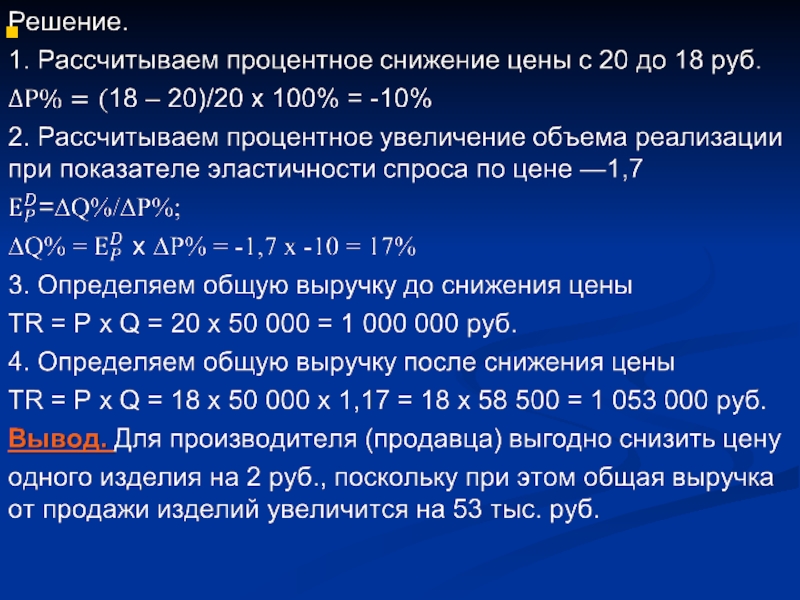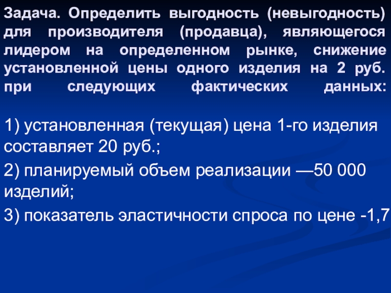 Слайд 34Задача. Определить выгодность (невыгодность) для производителя (продавца), являющегося лидером на определенном