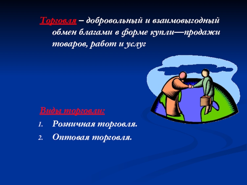 Слайд 5Торговля – добровольный и взаимовыгодный обмен благами в форме купли—продажи товаров,