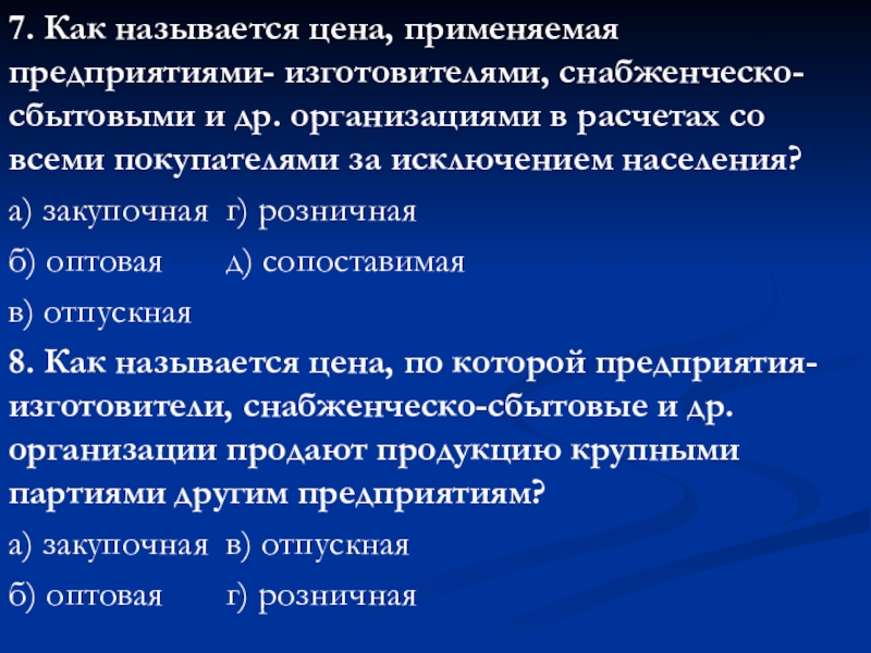 Слайд 287. Как называется цена, применяемая предприятиями- изготовителями, снабженческо-сбытовыми и др. организациями