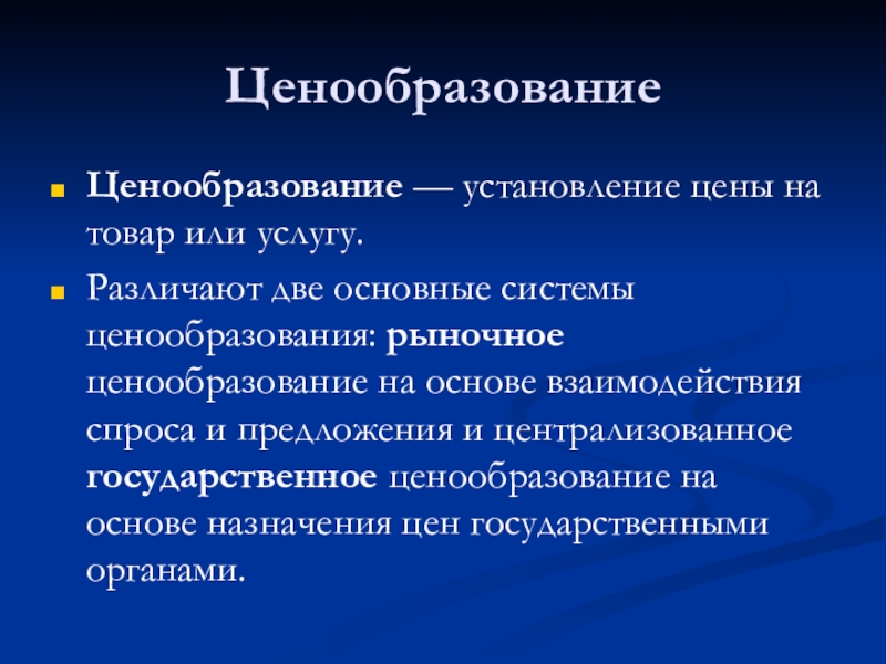 системы ценообразования: рыночное ценообразование на основе взаимодействия спроса и предложения и централизованное государственное ценообразование на основе назначения цен государственными органами.