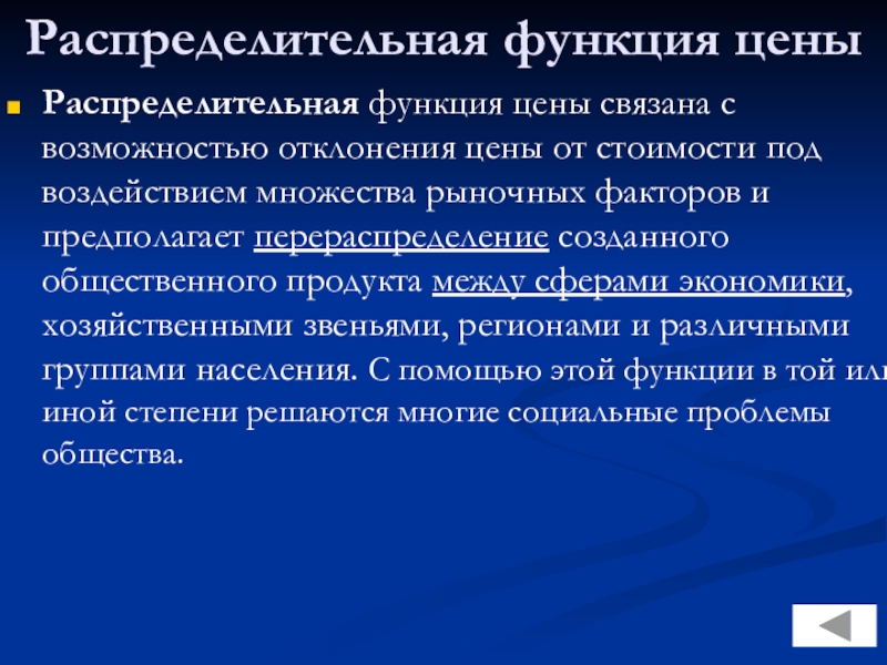 стоимости под воздействием множества рыночных факторов и предполагает перераспределение созданного общественного продукта между сферами экономики, хозяйственными звеньями, регионами и различными группами населения. С помощью этой функции в той или иной степени решаются многие социальные проблемы общества.