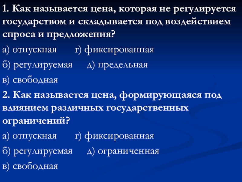 Слайд 151. Как называется цена, которая не регулируется государством и складывается под