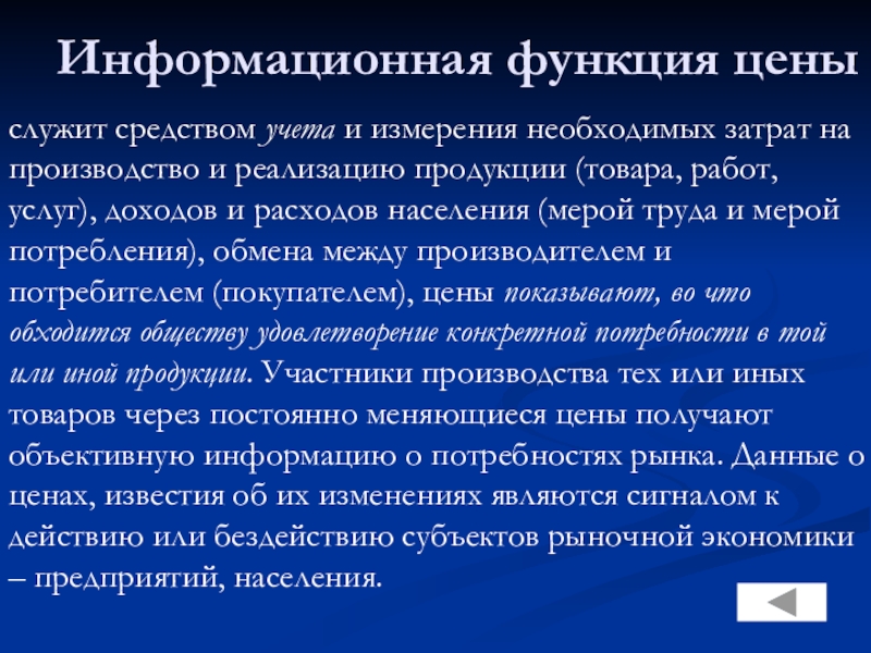 и реализацию продукции (товара, работ, услуг), доходов и расходов населения (мерой труда и мерой потребления), обмена между производителем и потребителем (покупателем), цены показывают, во что обходится обществу удовлетворение конкретной потребности в той или иной продукции. Участники производства тех или иных товаров через постоянно меняющиеся цены получают объективную информацию о потребностях рынка. Данные о ценах, известия об их изменениях являются сигналом к действию или бездействию субъектов рыночной экономики – предприятий, населения.
