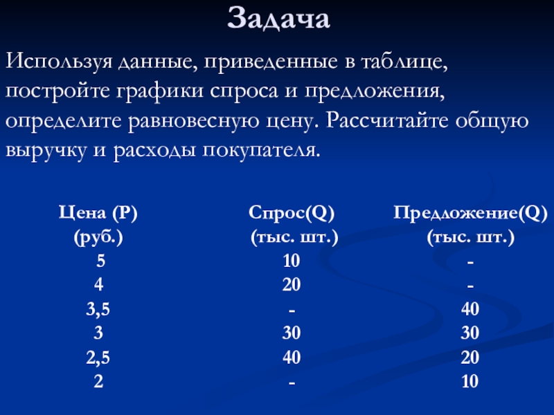 Используя данные, приведенные в таблице, постройте графики спроса и предложения,