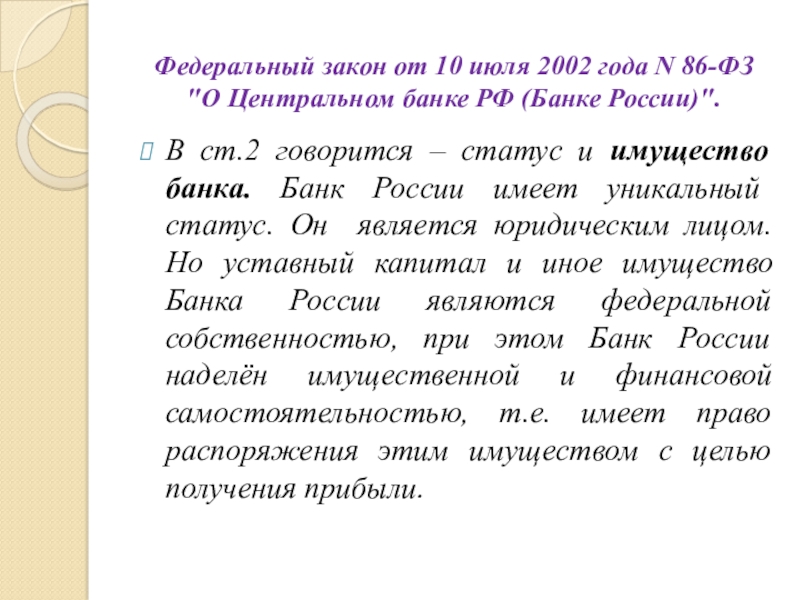 В ст.2 говорится – статус и имущество банка. Банк России имеет уникальный статус. Он является юридическим лицом. Но уставный капитал и иное имущество Банка России являются федеральной собственностью, при этом Банк России наделён имущественной и финансовой самостоятельностью, т.е. имеет право распоряжения этим имуществом с целью получения прибыли.