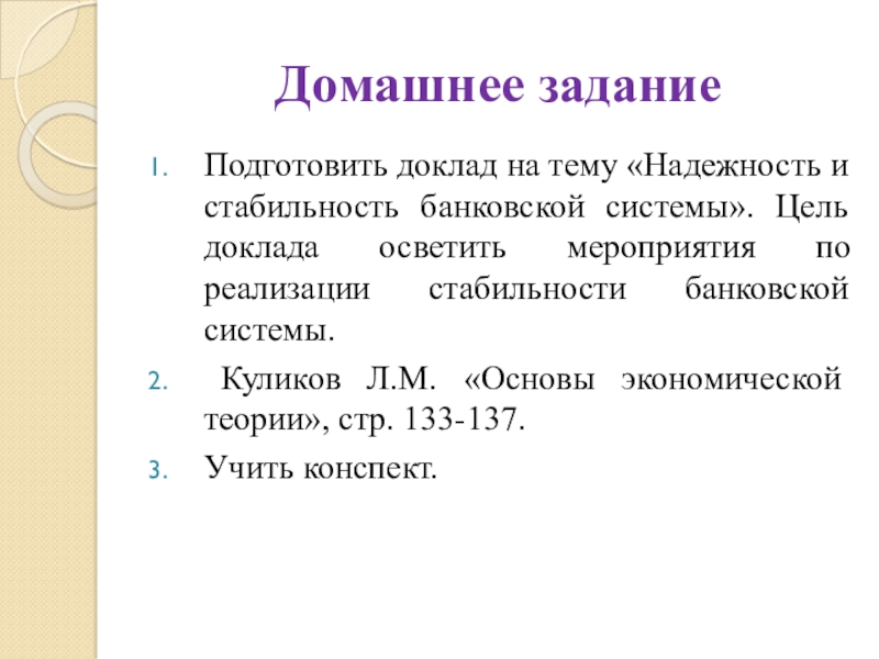 Подготовить доклад на тему «Надежность и стабильность банковской системы». Цель