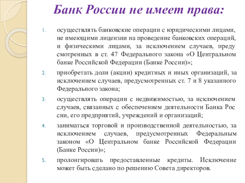 заниматься торговой и производственной деятельностью, за исключением случаев, предусмотренных Федеральным законом «О Центральном банке Российской Федерации (Банке России)»;