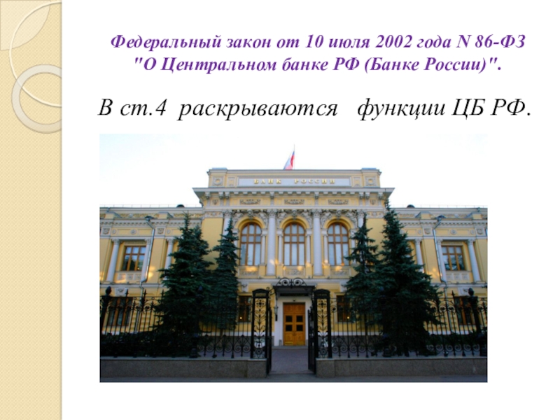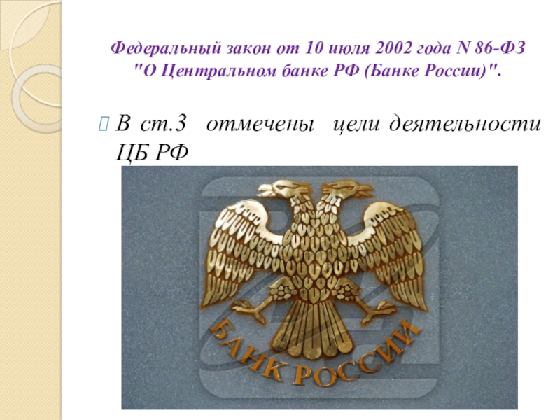 Слайд 13Федеральный закон от 10 июля 2002 года N 86-ФЗ
