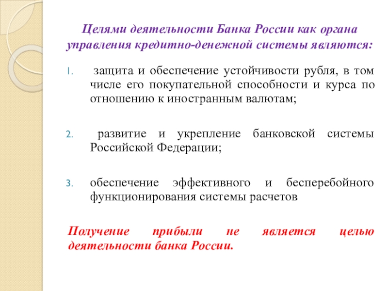 Слайд 14Целями деятельности Банка России как органа управления кредитно-денежной системы являются: