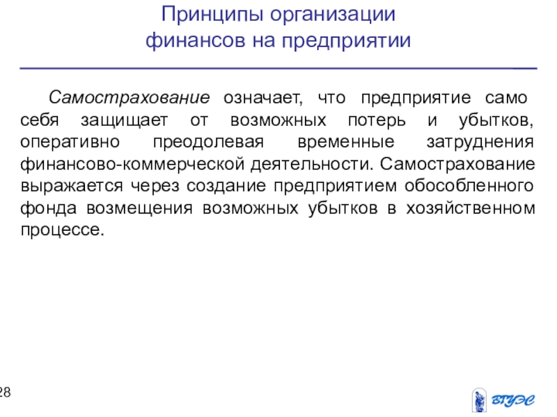 от возможных потерь и убытков, оперативно преодолевая временные затруднения финансово-коммерческой деятельности. Самострахование выражается через создание предприятием обособленного фонда возмещения возможных убытков в хозяйственном процессе.