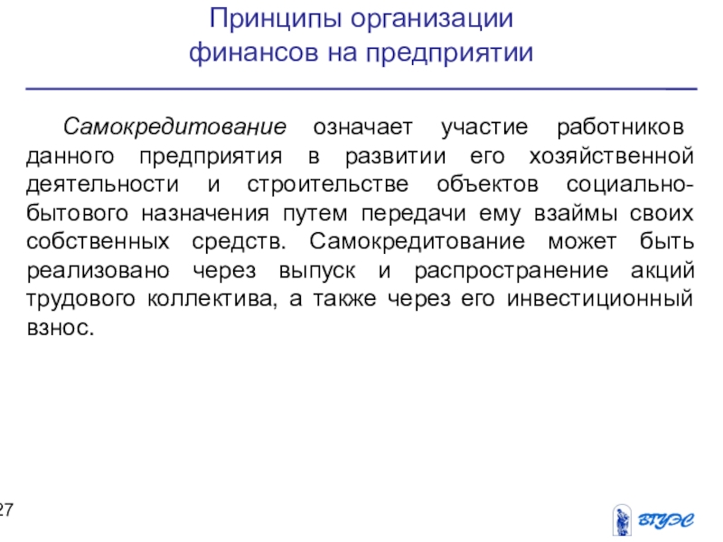 развитии его хозяйственной деятельности и строительстве объектов социально-бытового назначения путем передачи ему взаймы своих собственных средств. Самокредитование может быть реализовано через выпуск и распространение акций трудового коллектива, а также через его инвестиционный взнос.