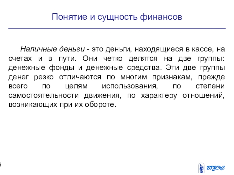 на счетах и в пути. Они четко делятся на две группы: денежные фонды и денежные средства. Эти две группы денег резко отличаются по многим признакам, прежде всего по целям использования, по степени самостоятельности движения, по характеру отношений, возникающих при их обороте.