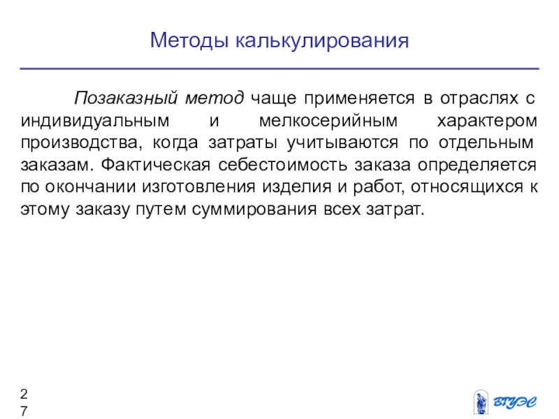 индивидуальным и мелкосерийным характером производства, когда затраты учитываются по отдельным заказам. Фактическая себестоимость заказа определяется по окончании изготовления изделия и работ, относящихся к этому заказу путем суммирования всех затрат.