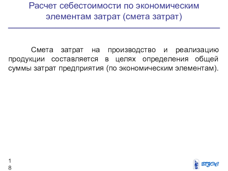 Слайд 18Расчет себестоимости по экономическим элементам затрат (смета затрат)