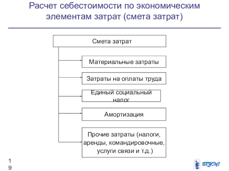 Слайд 19Расчет себестоимости по экономическим элементам затрат (смета затрат)