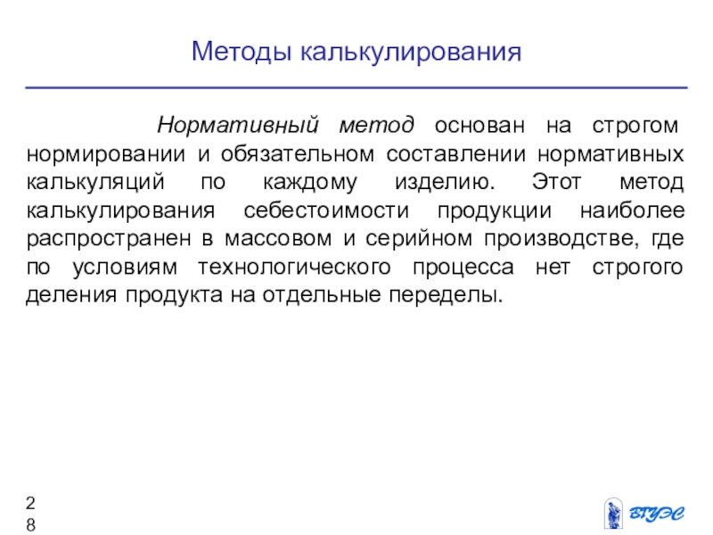 обязательном составлении нормативных калькуляций по каждому изделию. Этот метод калькулирования себестоимости продукции наиболее распространен в массовом и серийном производстве, где по условиям технологического процесса нет строгого деления продукта на отдельные переделы.