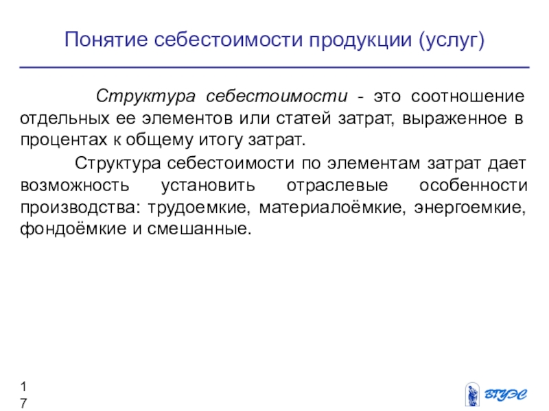 ее элементов или статей затрат, выраженное в процентах к общему итогу затрат.
