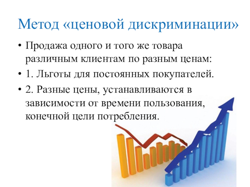 Метод «ценовой дискриминации»Продажа одного и того же товара различным клиентам по разным ценам:1. Льготы для постоянных покупателей.2.