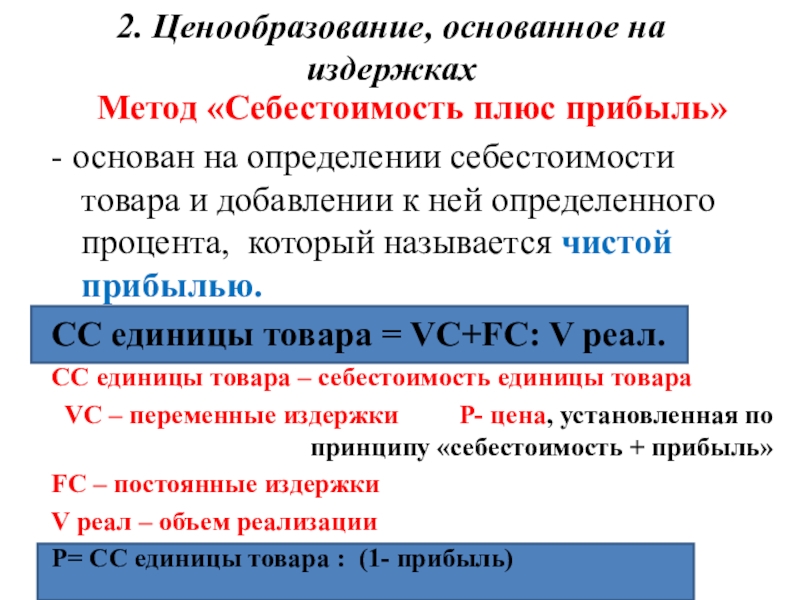 2. Ценообразование, основанное на издержках Метод «Себестоимость плюс прибыль» - основан на определении себестоимости товара и добавлении
