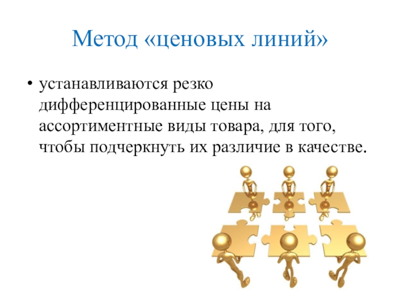 Метод «ценовых линий»устанавливаются резко дифференцированные цены на ассортиментные виды товара, для того, чтобы подчеркнуть их различие в