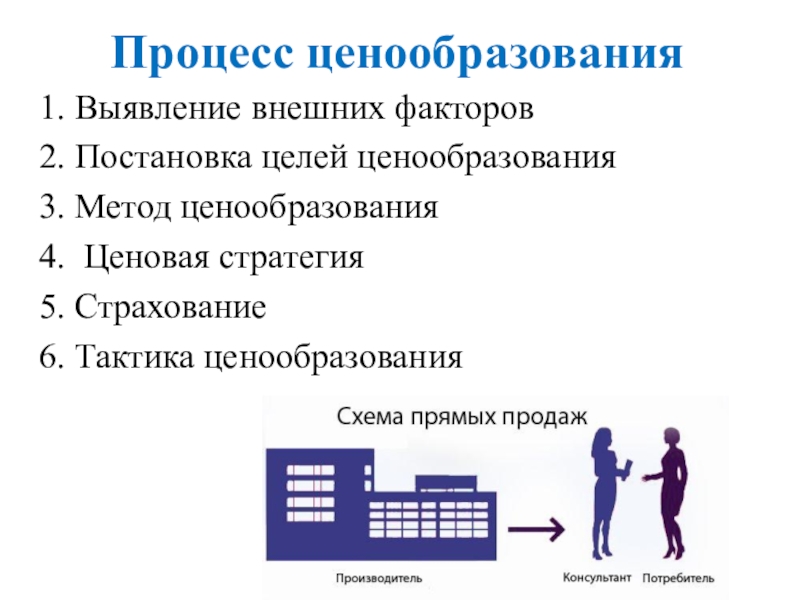Процесс ценообразования1. Выявление внешних факторов2. Постановка целей ценообразования3. Метод ценообразования4. Ценовая стратегия5. Страхование6. Тактика ценообразования