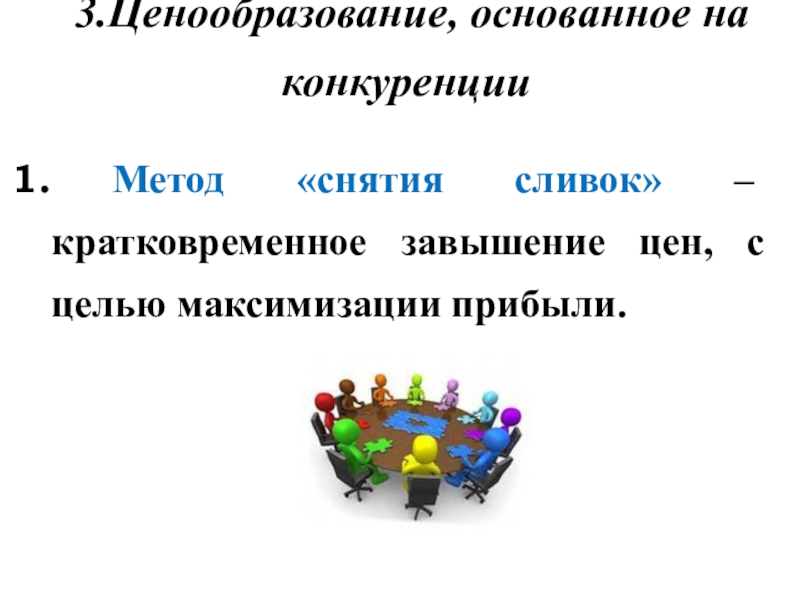3.Ценообразование, основанное на конкуренции Метод «снятия сливок» – кратковременное завышение цен, с целью максимизации прибыли.
